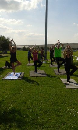 Employees from CATERPILLAR in Peckleton enjoying a Yoga session in the sunshine at the end of a hard days work .